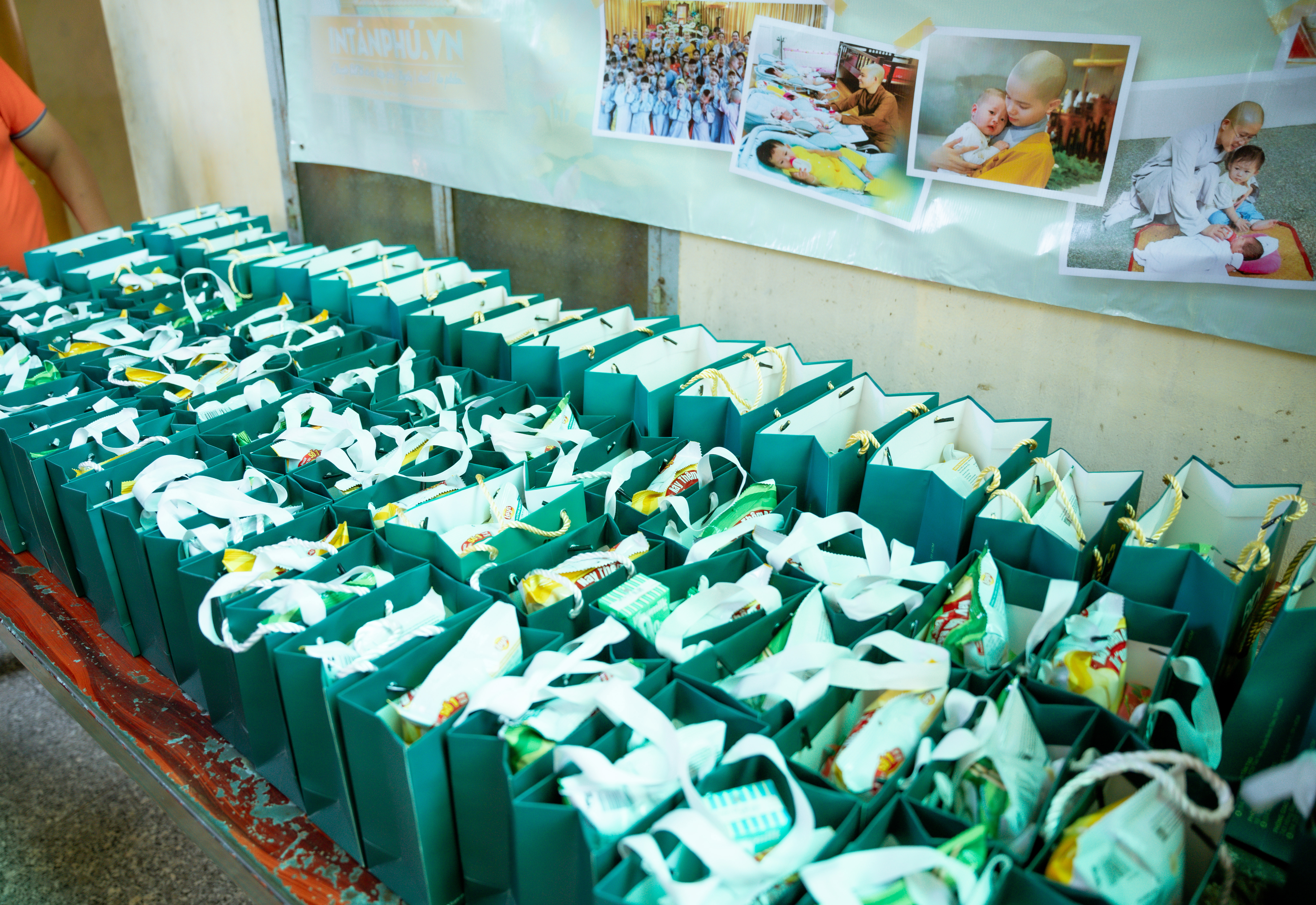 Ngay từ sáng sớm, tập thể cán bộ, nhân viên Công ty In Tân Phú đã chuẩn bị hơn 100 phần quà thiết thực gồm: Sữa, nhu yếu phẩm, đồ dùng học tập, bánh kẹo, ... và một số vật dụng cần thiết cho mái ấm.
