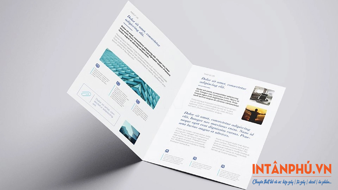 Brochure gấp đôi có thiết kế đơn giản, tờ in được gập làm đôi tạo thành 4 mặt nội dung. Loại này phù hợp để giới thiệu thông tin doanh nghiệp hoặc sản phẩm cơ bản.