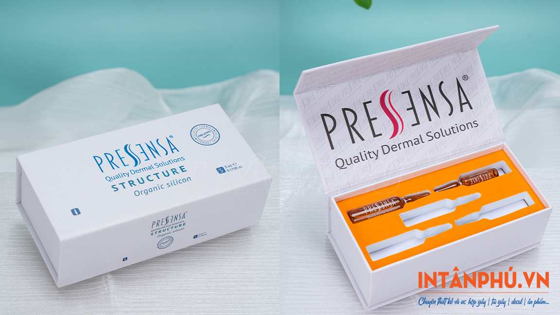 Logo, tên thương hiệu hoặc thông điệp được in trên hộp nên được bố trí hợp lý, tối giản, dễ nhận diện. Ngoài ra, có thể kết hợp các kỹ thuật gia công như ép kim/ép nhũ, dập nổi, dập chìm, … để làm nổi bật thông tin, gia tăng tính thẩm mỹ, đồng thời kỹ thuật cán màng bóng/ màng mờ còn giúp gia tăng độ bền cho hộp giấy.