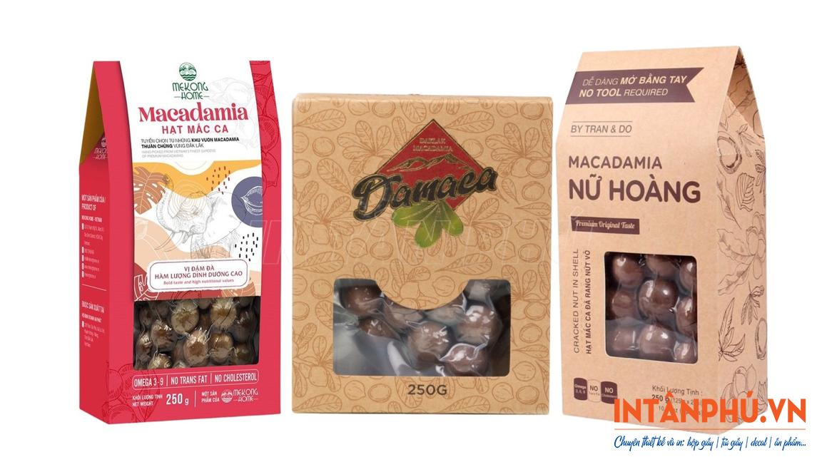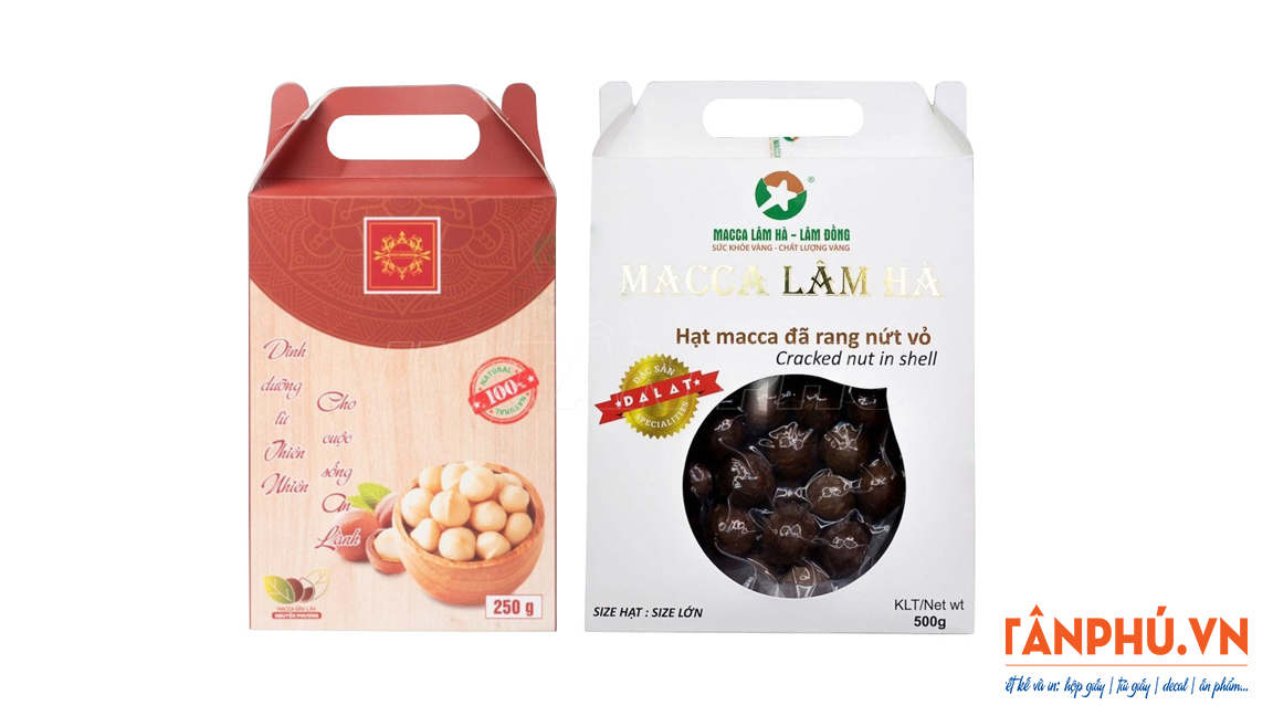 Các loại hộp giấy đựng hạt macca, hạnh nhân, óc chó, …  thường được sản xuất từ những chất liệu giấy cao cấp, thân thiện với môi trường. Nhờ cấu trúc chắc chắn, khả năng chống ẩm và chống thấm tốt, bao bì giấy giúp ngăn không khí và độ ẩm xâm nhập, hạn chế sự oxy hóa để giữ hạt luôn giòn, thơm và đảm bảo giá trị dinh dưỡng.