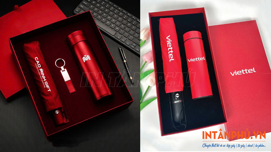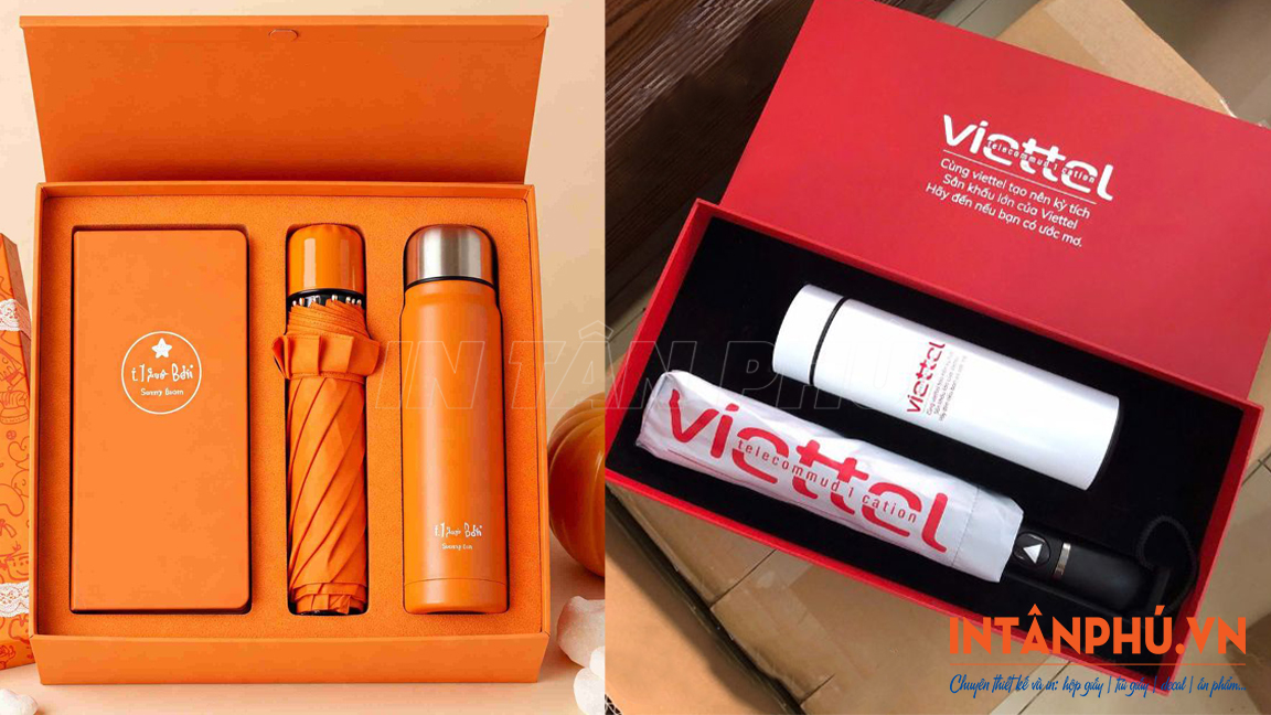 Với hộp giấy làm quà tặng doanh nghiệp, tính sang trọng, lịch sự và tinh tế là không thể thiếu. Một số gợi ý trong thiết kế hộp ô dù quà tặng như: