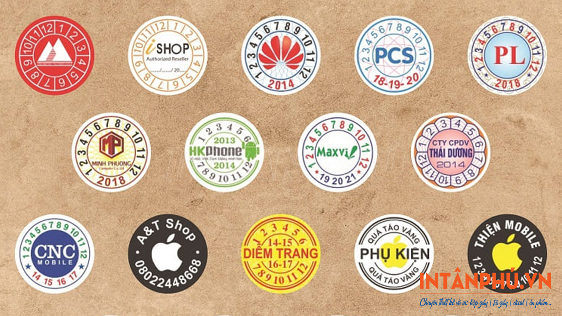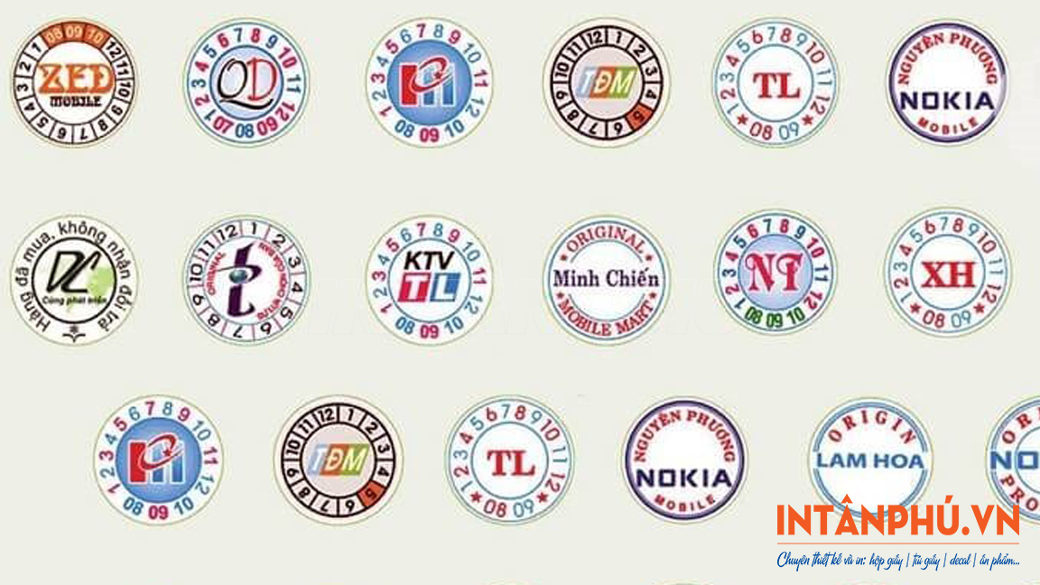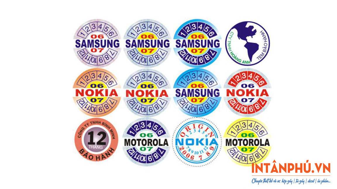 • Tem bảo hành hình tròn: Đường kính 0.8cm, 1cm – 1.2cm, 2cm – 2.2cm, …