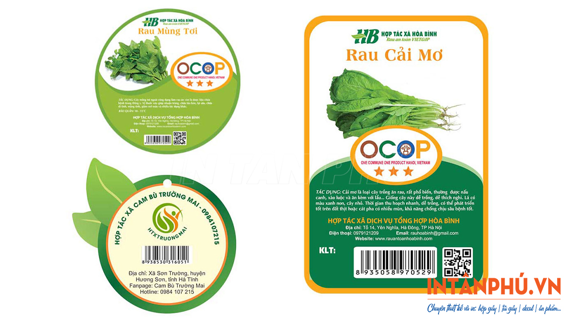 Đây là loại tem in đầy đủ các thông tin quan trọng như: đơn vị sản xuất, phân phối, thời gian thu hoạch, hạn sử dụng, số lô, mã vạch, mã QR, …