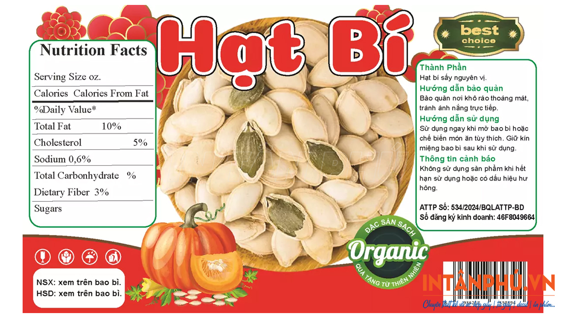 Tem nhãn hạt bí giúp truyền tải đầy đủ và minh bạch các thông tin cần thiết như thành phần, khối lượng, ngày sản xuất, hạn sử dụng và hướng dẫn bảo quản. Điều này giúp khách hàng an tâm hơn khi lựa chọn sản phẩm.