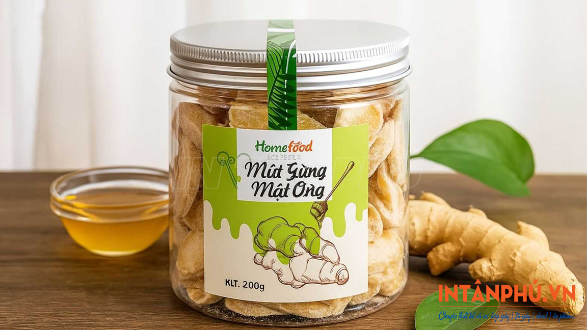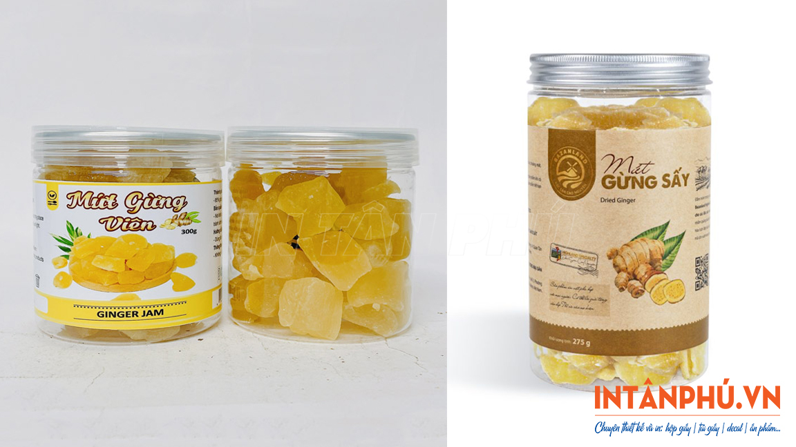 • Decal nhựa trong: Cho phép nhìn thấy sản phẩm bên trong, mang đến hiệu ứng chân thật. Loại decal này thích hợp mứt gừng cao cấp, bảo quản lạnh hoặc xuất khẩu.