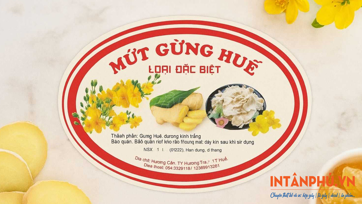 • Tạo niềm tin và sự chuyên nghiệp: Một chiếc tem mứt gừng được thiết kế chỉn chu, in ấn sắc nét giúp khách hàng yên tâm về nguồn gốc và chất lượng mứt gừng. Điều này tạo cảm giác tin cậy ngay từ lần đầu nhìn thấy sản phẩm.