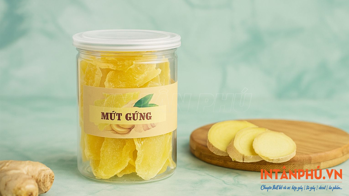 • Tuân thủ pháp luật: Theo quy định, các sản phẩm thực phẩm như mứt gừng bắt buộc phải có nhãn mác đầy đủ. Việc in tem đúng chuẩn giúp doanh nghiệp hoạt động hợp pháp và tránh rủi ro pháp lý.