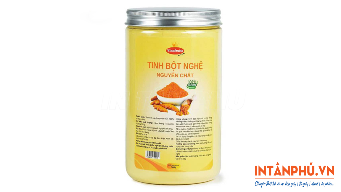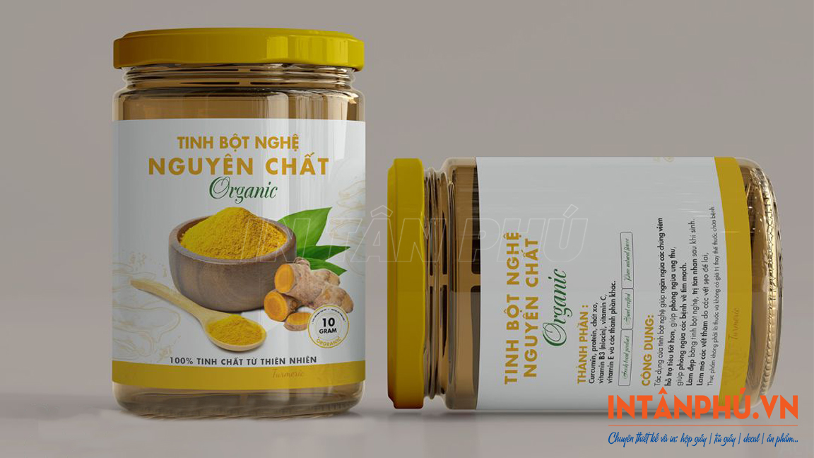 Tinh bột nghệ là sản phẩm thực phẩm thiên nhiên, thường được đóng trong hũ, lọ hoặc túi zip, tem nhãn tinh bột nghệ cần đảm bảo hình ảnh sắc nét, màu sắc chuẩn và bám dính tốt. Hai công nghệ phổ biến hiện nay gồm in offset và in kỹ thuật số, mỗi công nghệ in phù hợp với các mục đích khác nhau.