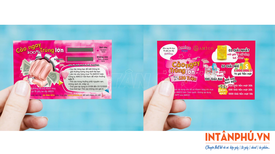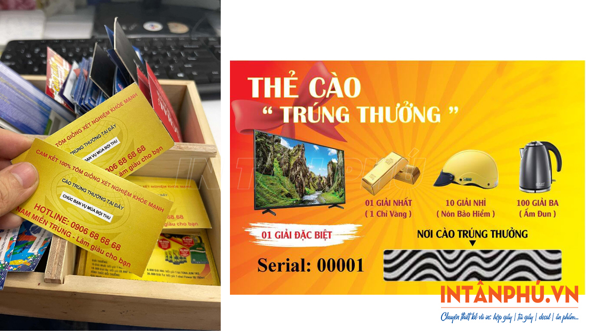 In thẻ cào trúng thưởng là giải pháp marketing hiệu quả được nhiều doanh nghiệp lựa chọn trong các chương trình khuyến mãi, tri ân khách hàng, kích cầu tiêu dùng. Với khả năng tạo sự tò mò, hứng thú và thúc đẩy hành động mua nhanh chóng, thẻ cào trúng thưởng ngày càng được ứng dụng rộng rãi trong nhiều lĩnh vực như bán lẻ, mỹ phẩm, spa, nhà hàng, bất động sản, giáo dục, … Cùng In Tân Phú tìm hiểu chi tiết về thẻ cào trúng thưởng cùng địa chỉ in thẻ cào trúng thưởng, thẻ khuyến mãi uy tín, giá rẻ qua bài viết ngay sau đây.