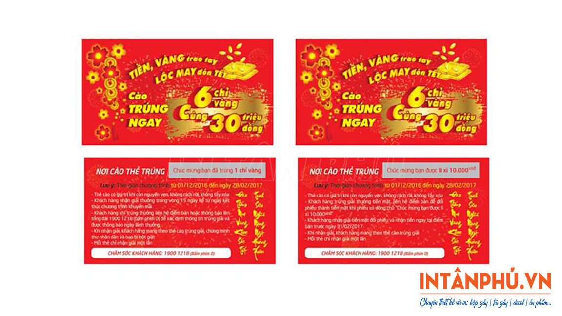 Mong rằng bài viết đã phần nào mang đến cho quý khách hàng, quý bạn đọc những thông tin bổ ích về dịch vụ in thẻ cào trúng thưởng. Nếu bạn cần tư vấn hoặc báo giá về bất cứ dịch vụ in ấn phẩm quảng cáo nào của chúng tôi, quý khách có thể truy cập nhanh vào Intanphu.vn để theo dõi đầy đủ thông tin chi tiết hoặc gọi vào hotline để được tư vấn và báo giá nhanh chóng.