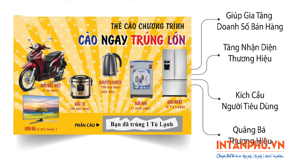 - Thu hút sự chú ý của khách hàng - kích cầu mua sắm: Hình thức “cào để trúng thưởng” tạo sự tò mò, kích thích khách hàng tham gia chương trình khuyến mãi ngay tại điểm bán.