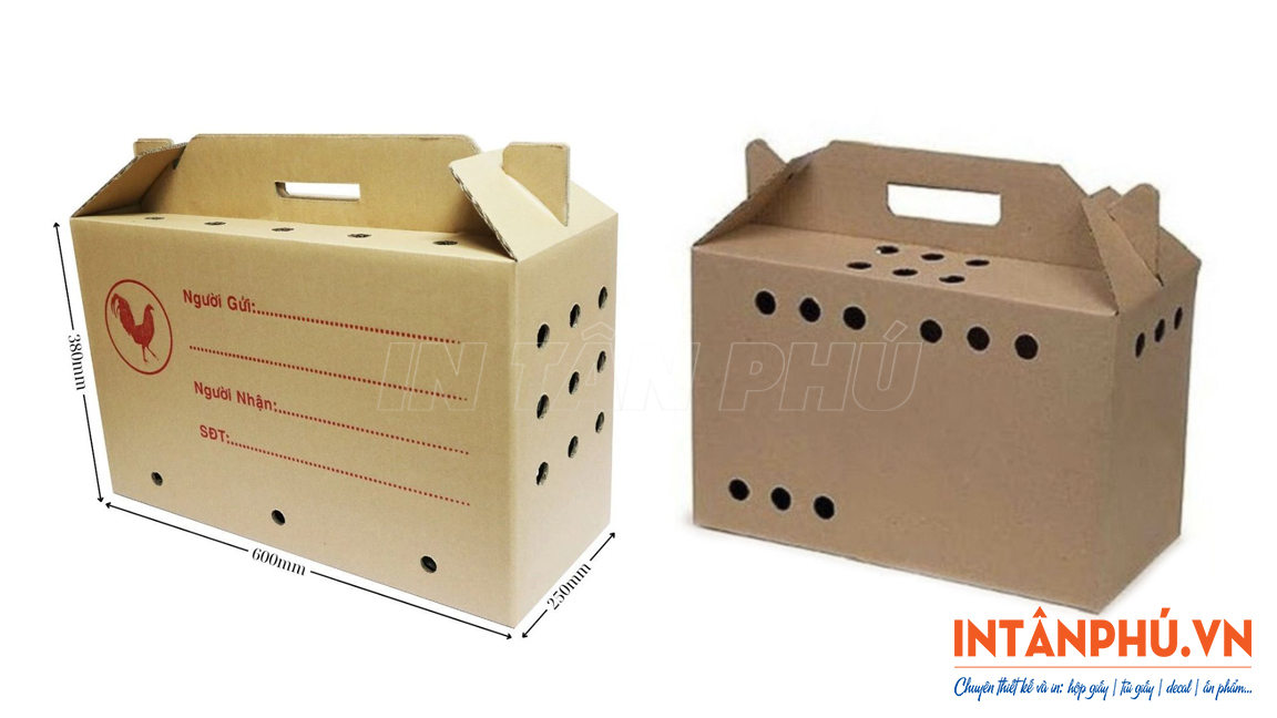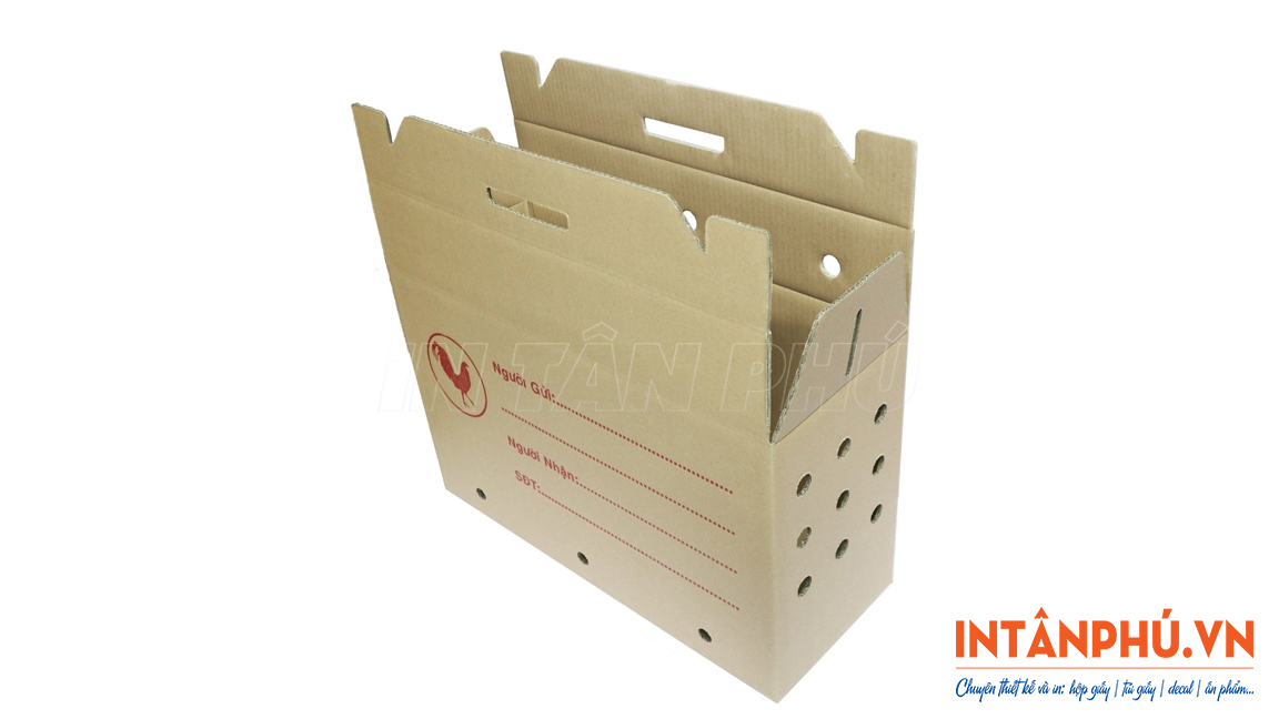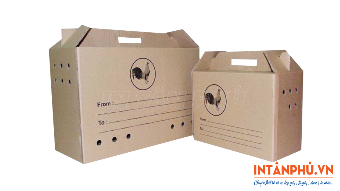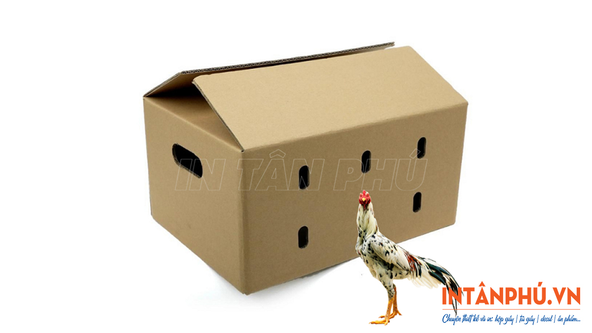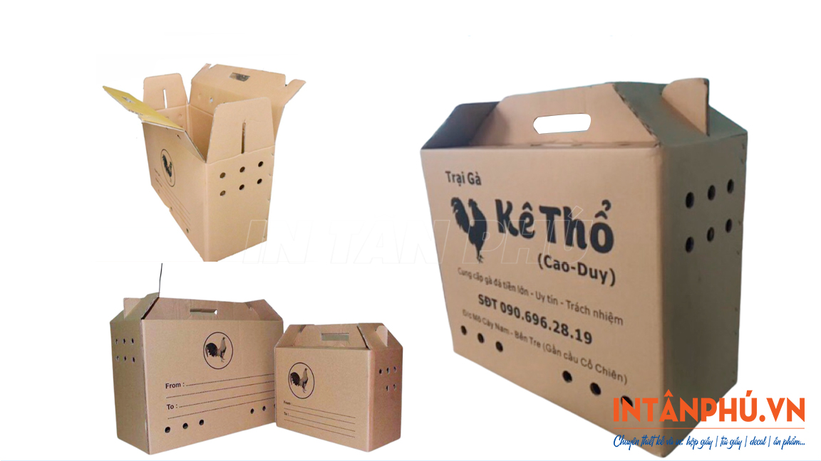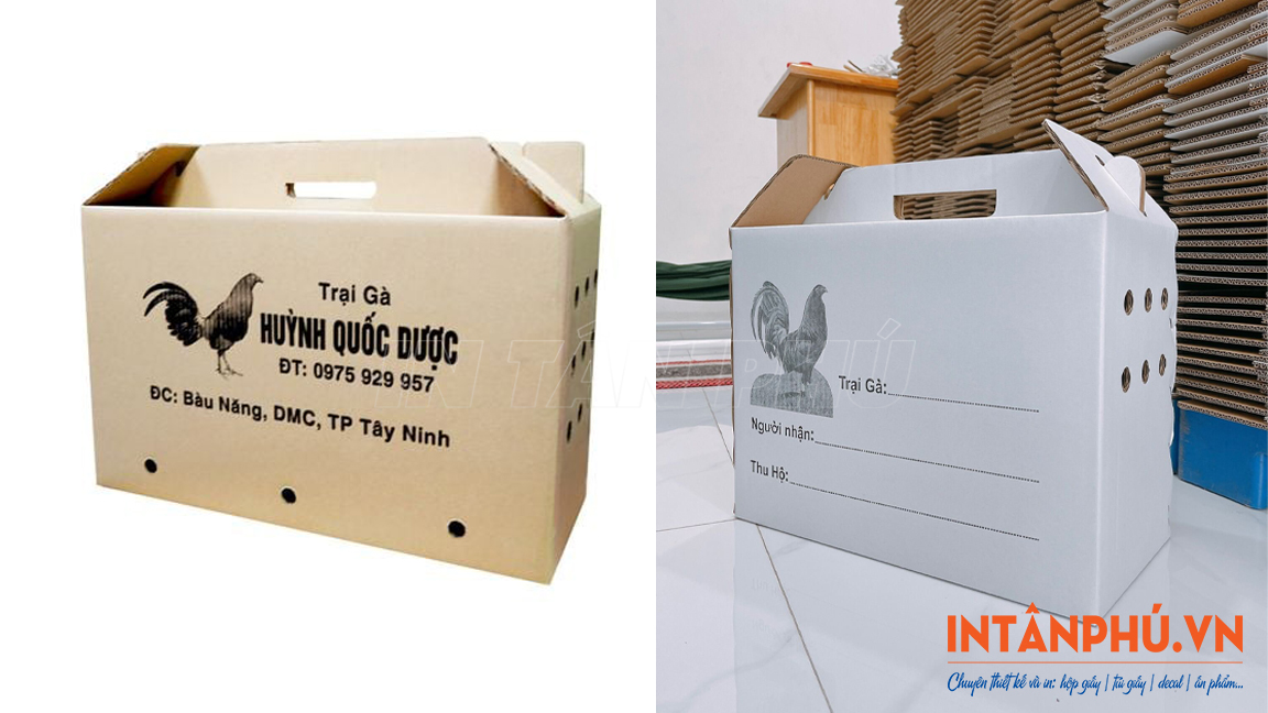 Về kích thước, tùy theo loại gà (gà tre, gà ta, gà nòi, ...) và số lượng gà, In Tân Phú sẽ tư vấn chọn loại thùng phù hợp. Thông thường: