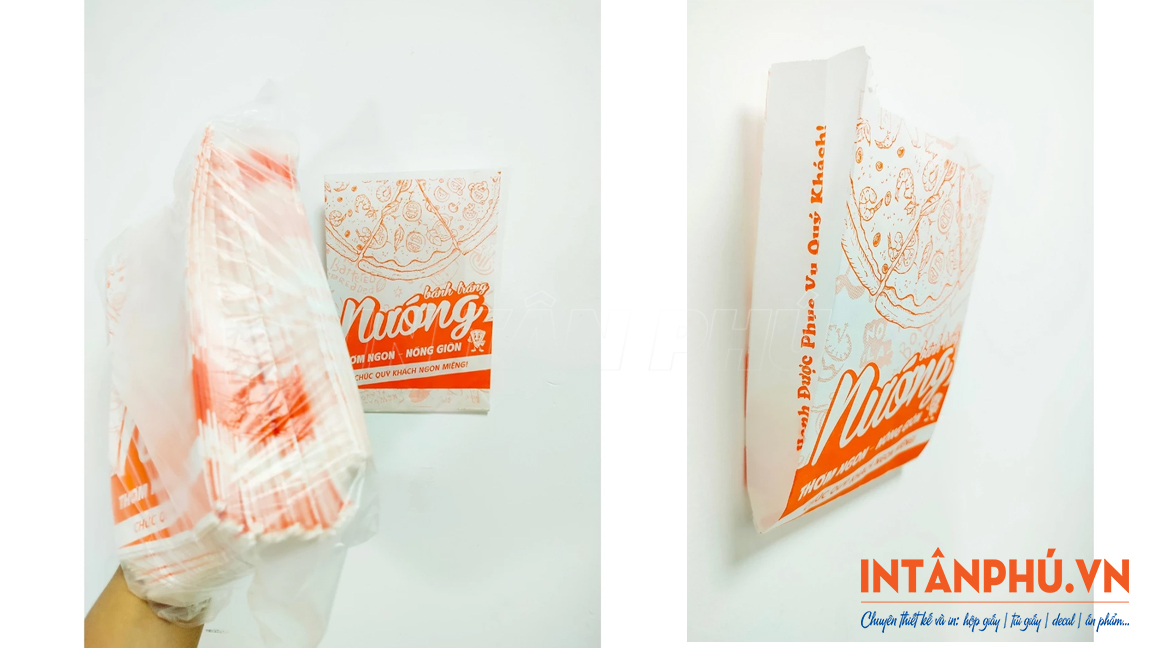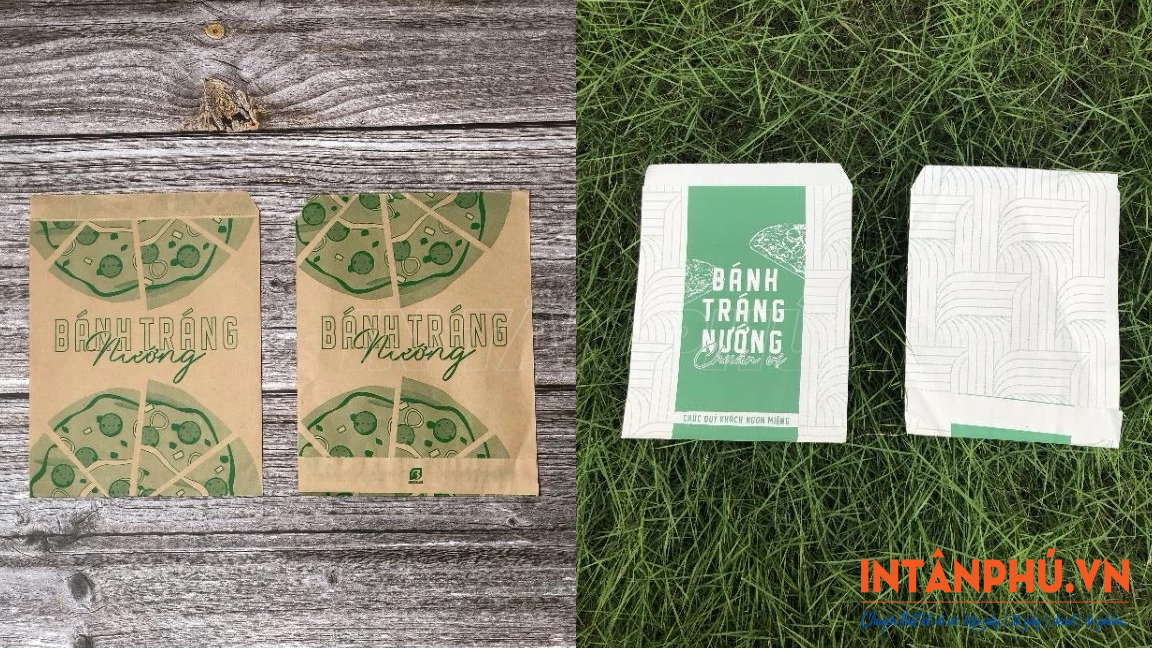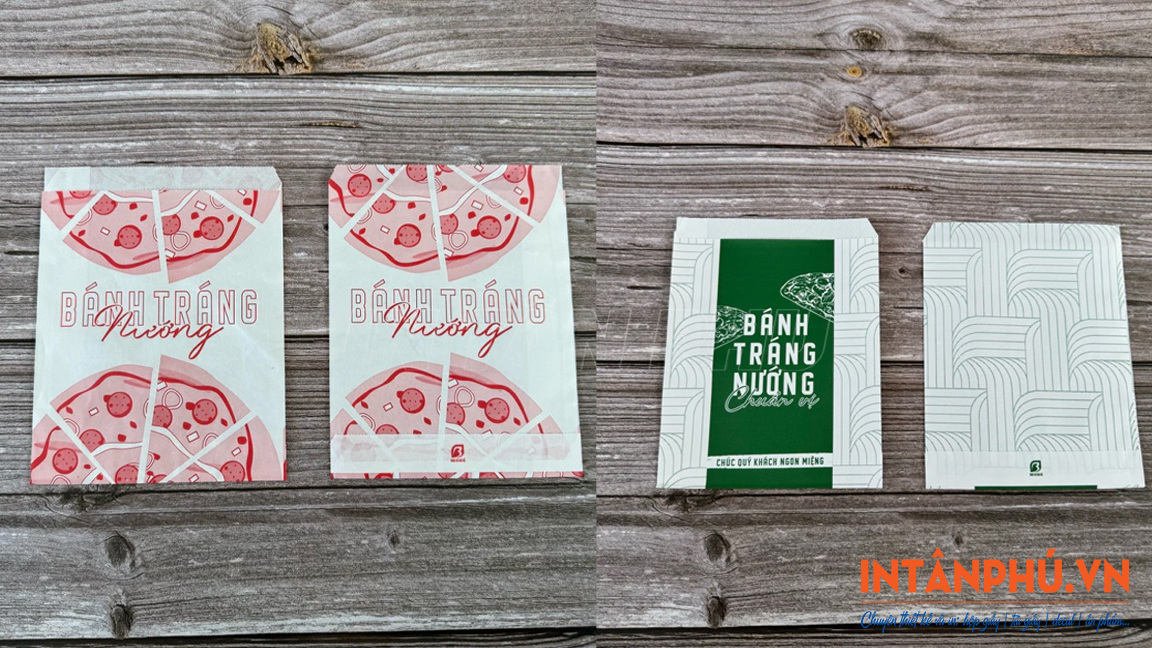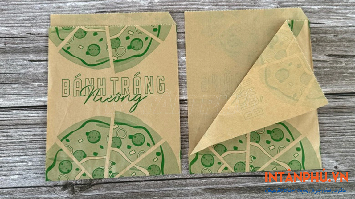 Tùy vào kích thước bánh và nhu cầu sử dụng, túi giấy đựng bánh tráng nướng tại In Tân Phú sẽ được in theo yêu cầu để đảm bảo vừa vặn, bánh không bị xô lệch gây vỡ nát trong quá trình vận chuyển.