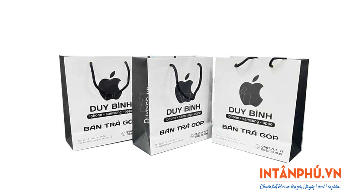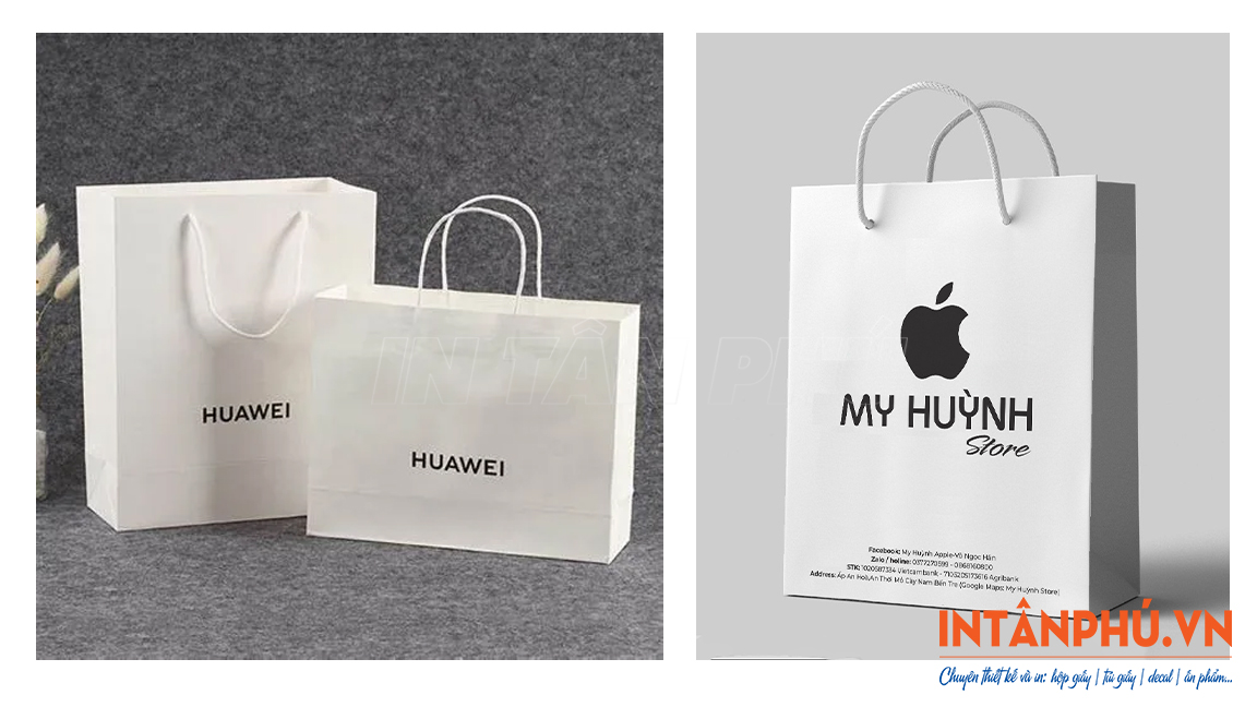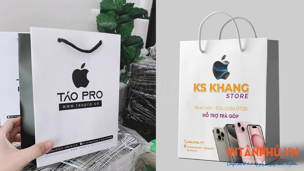 Túi giấy thiết kế đẹp mắt, sang trọng, bề mặt túi được in ấn chi tiết, ấn tượng logo, tên thương hiệu và thông tin liên hệ sẽ giúp cửa hàng điện thoại gia tăng độ nhận diện, lan tỏa hình ảnh đến nhiều khách hàng hơn.