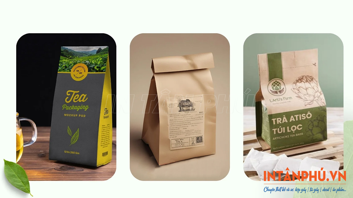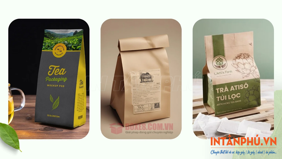 Túi giấy đựng trà hiện nay được thiết kế với nhiều kiểu dáng đa dạng, phù hợp cho từng nhu cầu đóng gói: